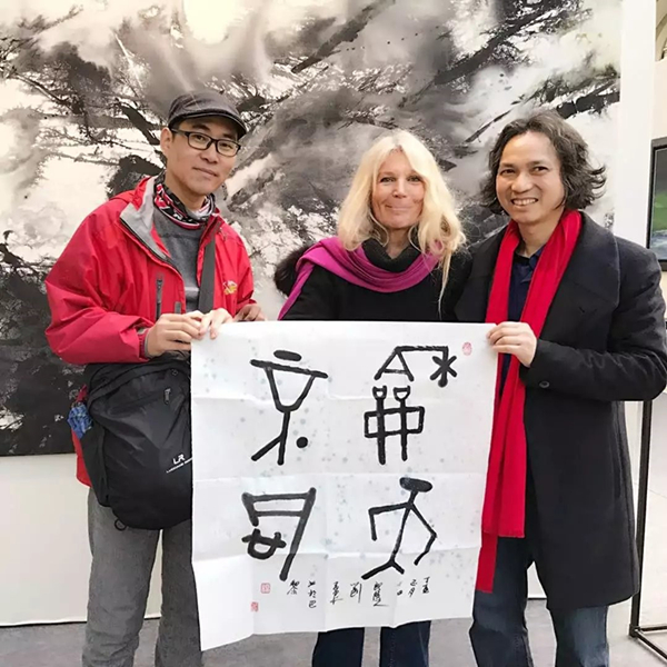 青年藝術家劉勇良與獨立沙龍主席Lyliane MERIT女士親切交談,并向獨立沙龍主席贈送書法作品