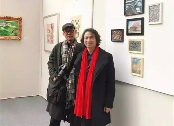 青年藝術家劉勇良和法國著名法籍華人中西方藝術評論家葉星球在參展作品前合影