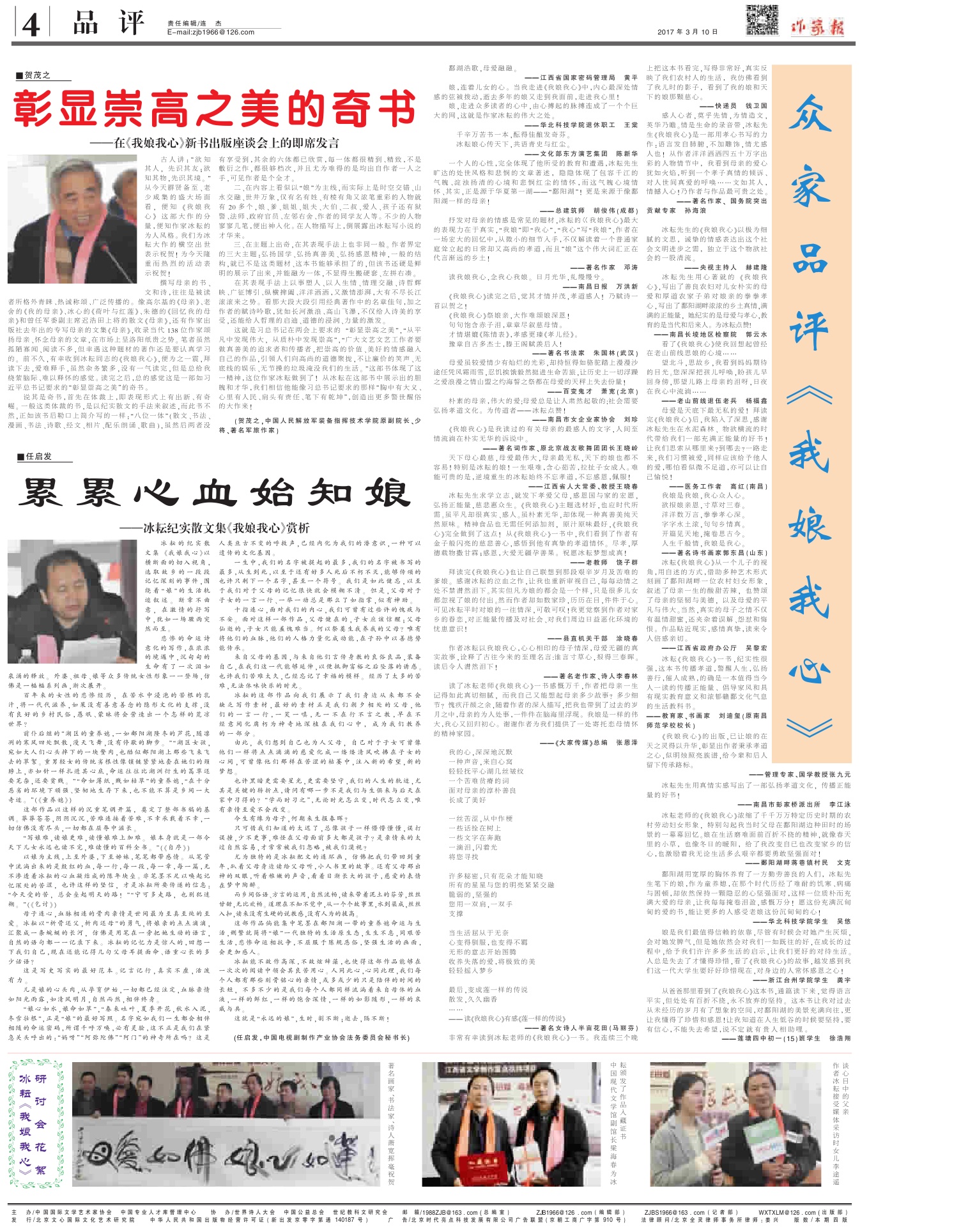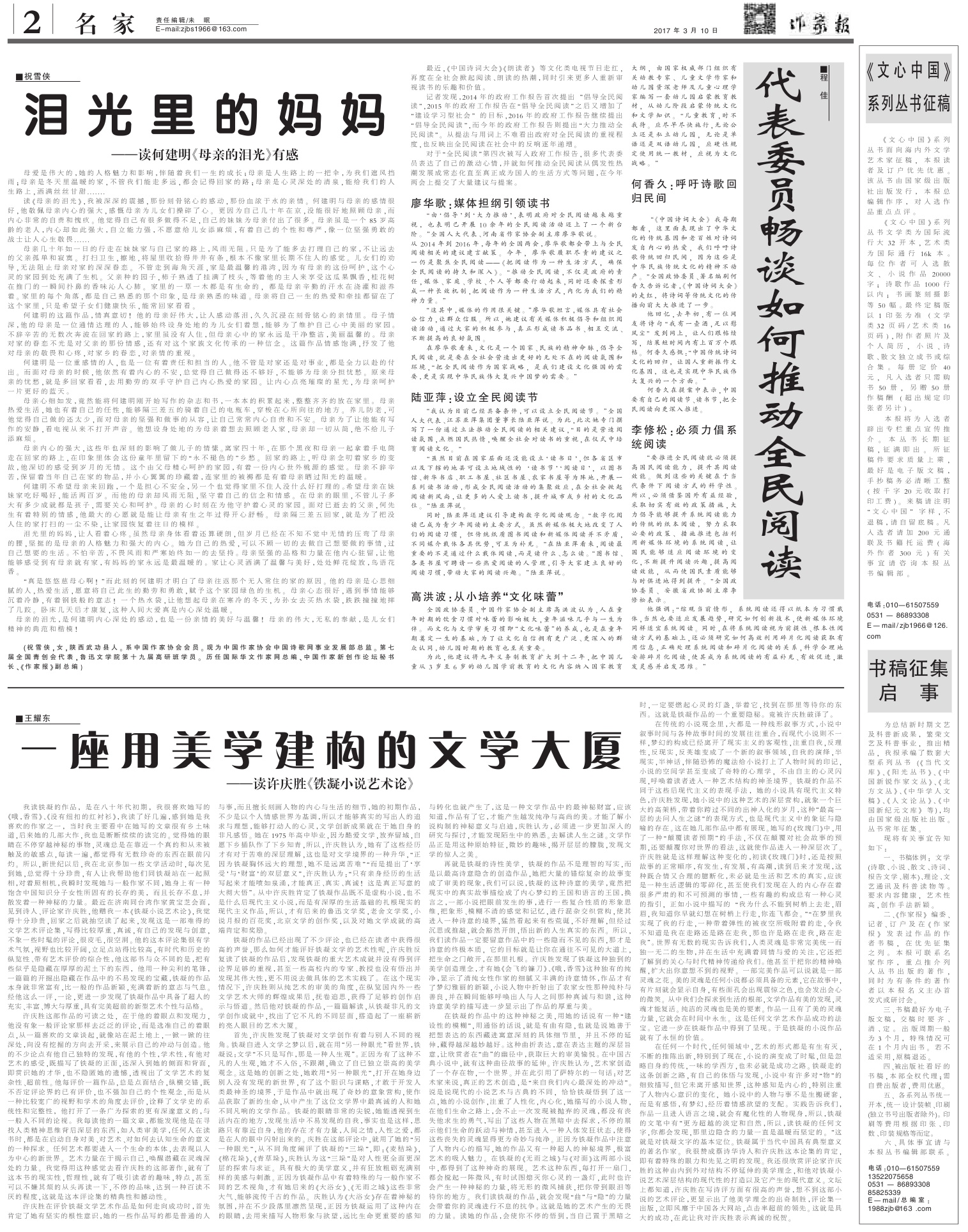 核心提示:3月10日報刊版樣。文藝界代表發(fā)出了自己的聲音:不但為社會民生建言獻策還暢談如何推動全民閱讀。本期有校園專版,刊有教學研究論文及師生作品。冰耘紀實散文集《我娘我心》反響熱烈,這也說明了真情的文字最能打動讀者,特辟專版再度推介。