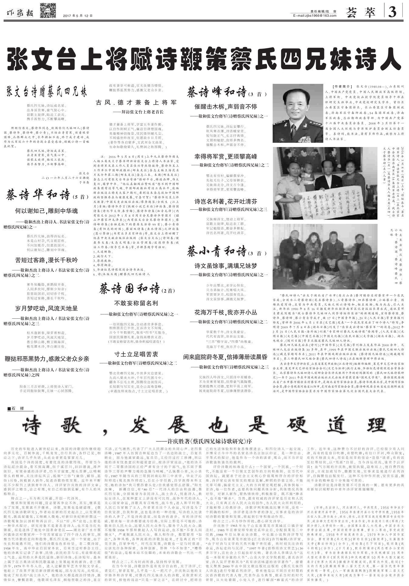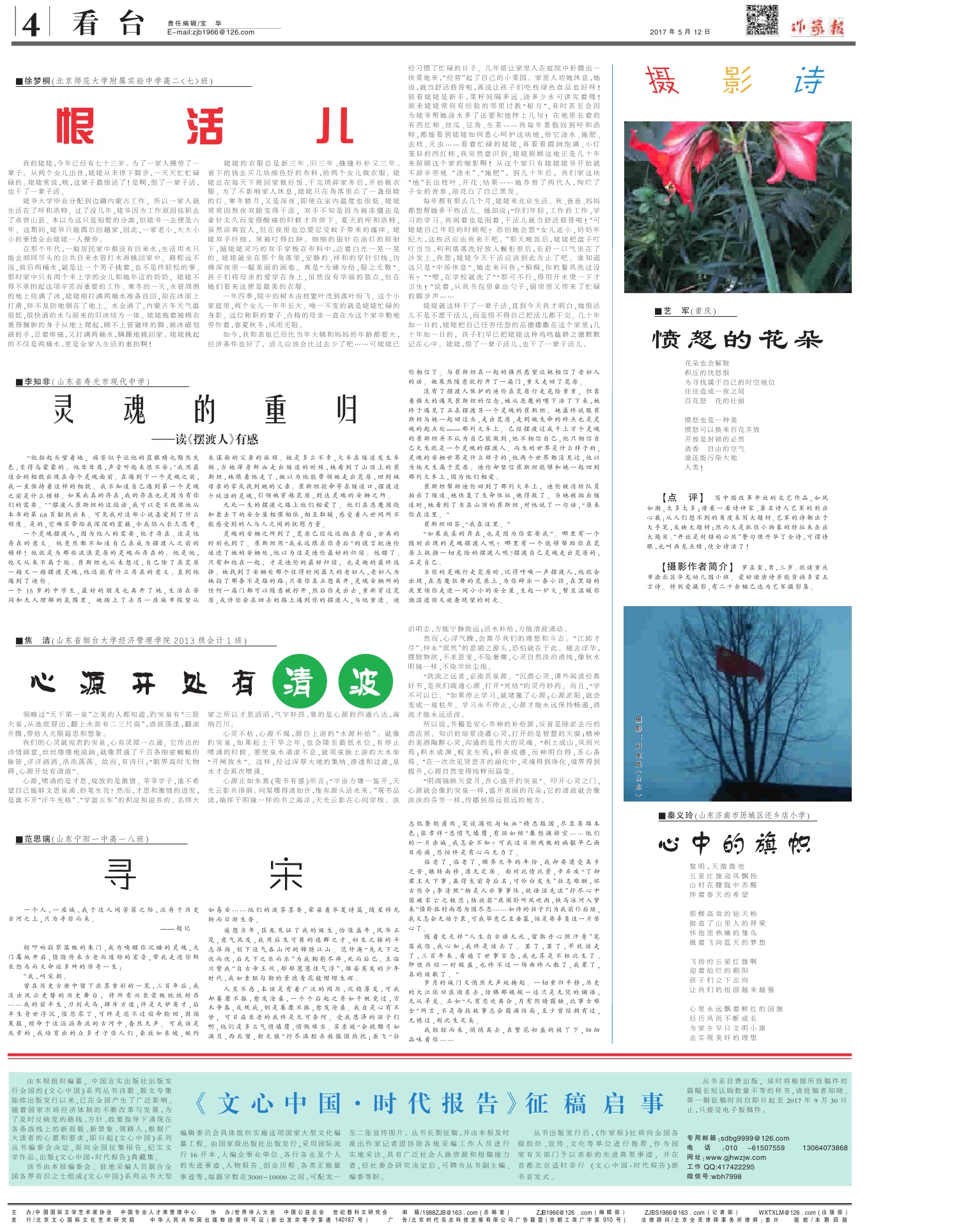 補發(fā)5月12日報刊電子版。本期一版文事新聞,分別有中國通俗文藝研究會第七屆會員代表大會在京召開,本社社長被選為理事。房國東家訓集《心田留與子孫耕》在京舉行研討會。山東省安丘市詩詞楹聯(lián)協(xié)會成立大會召開。近日“一帶一路”高峰論壇在京舉行,本期選編了與“一帶一路”相關(guān)的文章,側(cè)重介紹了“一帶一路”在文化與文學上帶給我們的影響。三版專版推介了張文臺上將賦詩鞭策“戰(zhàn)士詩人”蔡詩華兄妹四人的相關(guān)文章及詩書往來。四版主要選發(fā)了一批學生作品和攝影詩作品。詩書在心,愿大家新的一周工作愉快!