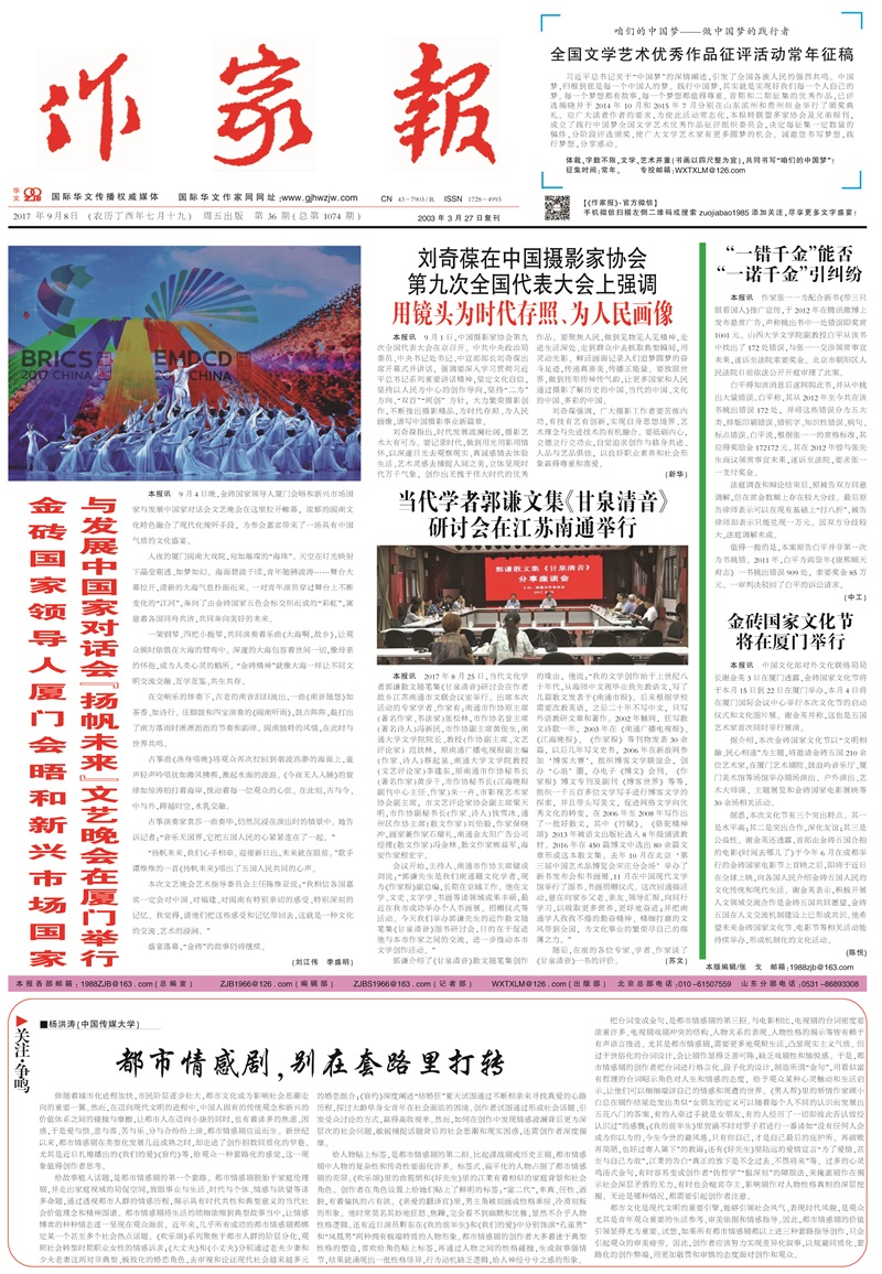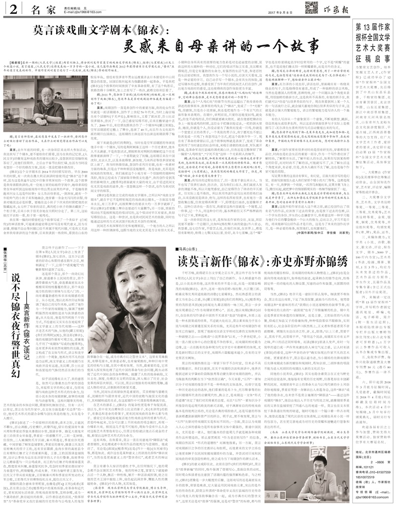 核心提示:《作家報》2017.9.8 第36期(總第1074期)《金磚國家領(lǐng)導(dǎo)人廈門會晤和新興市場國家與發(fā)展中國家對話會“揚(yáng)帆未來”文藝晚會在廈門舉行》《莫言談戲曲文學(xué)劇本《錦衣》:靈感來自母親講的一個故事》《說不盡錦衣夜行警世真幻——莫言新作《錦衣》讀記 張清華(北京)《讀
