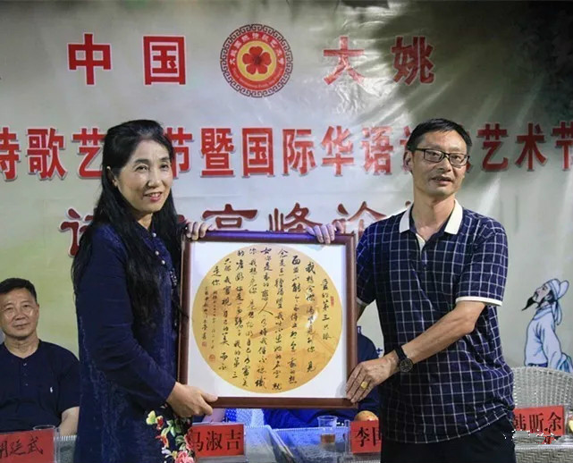 李國榮部長和韓昕余女士授牌予大姚文聯(lián)馬淑吉書記與大姚詩詞楹聯(lián)協(xié)會陳杰主席
