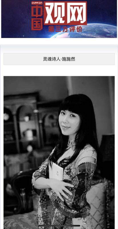 據了解,施施然本名袁詩萍,詩人,畫家,主編《中國女詩人詩選》,已經出版了詩畫集《走在民國的街道上》(臺灣)、詩集《唯有黑暗使靈魂溢出》、《青衣記》、《杮子樹》等4部,系中國作協會員,河北文學院簽約作家,曾獲河北省文藝振興獎、《現代青年》最受歡迎青年詩人獎、中國作協重點作品扶持、三月三詩歌獎等,部分詩作被翻譯為英語、瑞典語、羅馬尼亞語、法語等語言推介到海外,國畫作品多次入選國際國內畫展并被收藏。