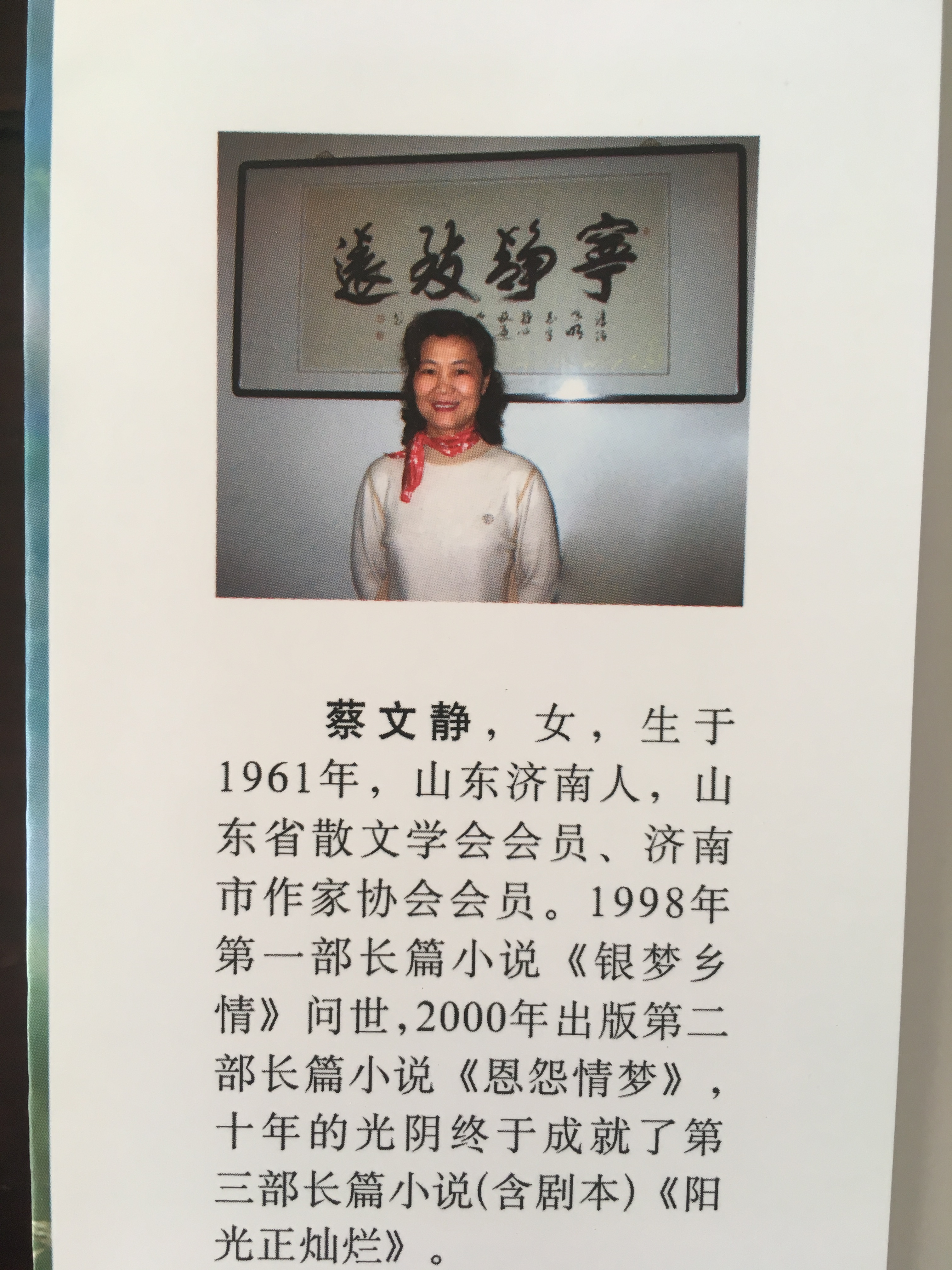 蔡文靜 女,網(wǎng)名老啞客,山東濟(jì)南人,山水畫(huà)者。系山東散文學(xué)會(huì)會(huì)員,濟(jì)南市作家協(xié)會(huì)會(huì)員。已出版長(zhǎng)篇小說(shuō)《銀夢(mèng)鄉(xiāng)情》《恩怨情夢(mèng)》《戲說(shuō)銀行故事》以及劇本《陽(yáng)光正燦爛》。近期開(kāi)始涉足中國(guó)國(guó)畫(huà)。