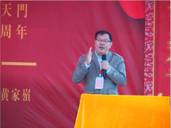 隨后北京的袁義達(dá)教授、鄭州的張新斌所長(zhǎng)、江夏堂的黃德光副秘書(shū)長(zhǎng)、福建的黃致宏會(huì)長(zhǎng)、潢川的黃運(yùn)庚會(huì)長(zhǎng)、吉水的黃文輝秘書(shū)長(zhǎng)、上海的黃俊松會(huì)長(zhǎng)、琬公后裔代表黃姚林以及他姓代表魯鳴皋會(huì)長(zhǎng)等各地嘉賓代表依次上臺(tái)為此次慶典活動(dòng)致賀。袁義達(dá)教授講到:“今天被邀請(qǐng)來(lái)參加紀(jì)念黃琬公遷徙天門(mén)黃家?guī)X650周年慶典活動(dòng),我感到非常的榮幸。像這種‘始遷祖’的紀(jì)念活動(dòng),是我有生以來(lái)第一次參加的,我的內(nèi)心非常感動(dòng)。此次活動(dòng)是經(jīng)過(guò)了幾個(gè)月的充分準(zhǔn)備,在昨晚的座談會(huì)中各地黃氏宗親就此也進(jìn)行了深入探討,這些都深刻體現(xiàn)了黃氏族人銘記先祖和發(fā)揚(yáng)傳統(tǒng)文化的良好家風(fēng)。”張新斌所說(shuō):“今天是黃琬公遷徙天門(mén)黃家?guī)X650周年的大慶,琬公在天門(mén)東岡落地生根,他代表著黃家腳踏實(shí)地,奮斗不息的精神。今天借助這次活動(dòng),相信天門(mén)黃家的子孫們一定會(huì)將黃氏的良好家風(fēng)、家訓(xùn)發(fā)揚(yáng)光大!”
