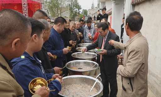 正午12點(diǎn),晴空暖照,彩旗飄揚(yáng),一派祥和氣象。此時(shí)熱氣騰騰,芳香四溢的五大鍋“五福羹”已經(jīng)擺放在宗祠門(mén)前。黃斌主席親自用香蔥、芝麻等食材在五福羹上畫(huà)作太極圖,為五福羹啟封,隨后盛上滿滿一碗五福羹,敬拜黃琬公靈位。接著黃斌主席及天門(mén)黃氏宗親聯(lián)誼會(huì)幾位代表依次為在場(chǎng)300多位黃氏宗親、琬公后裔、姓氏專(zhuān)家、學(xué)者盛羹賜福。相傳五福羹為天門(mén)黃氏先祖黃琬公發(fā)明,逢年過(guò)節(jié)在宗祠求賜五福羹,可以保平安,興家運(yùn),五福臨門(mén),益壽延年。怡人風(fēng)景聚重陽(yáng),美味福羹分外香。