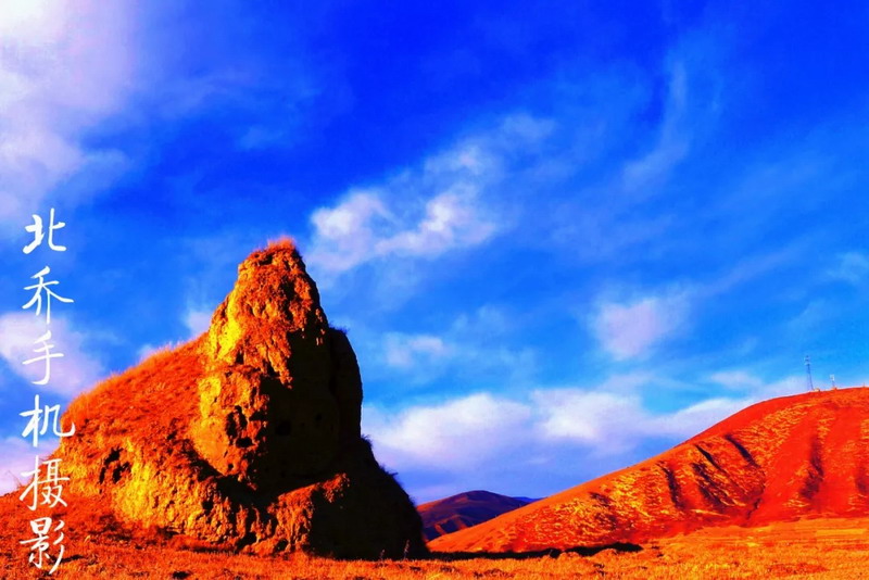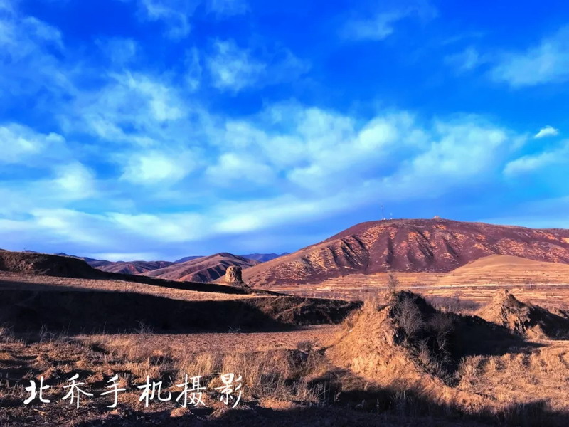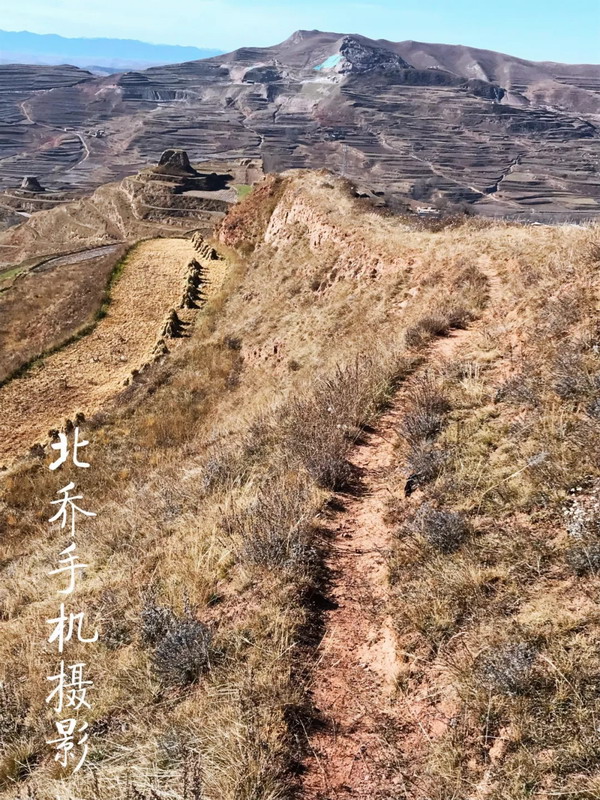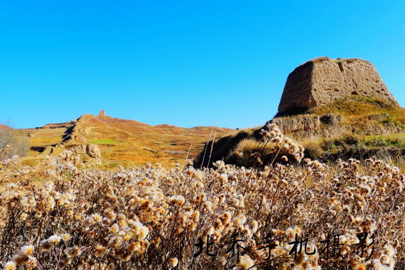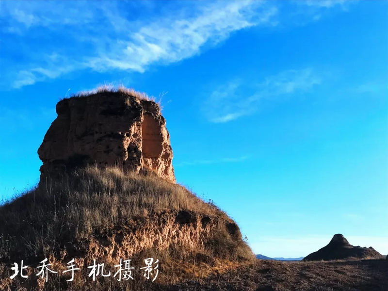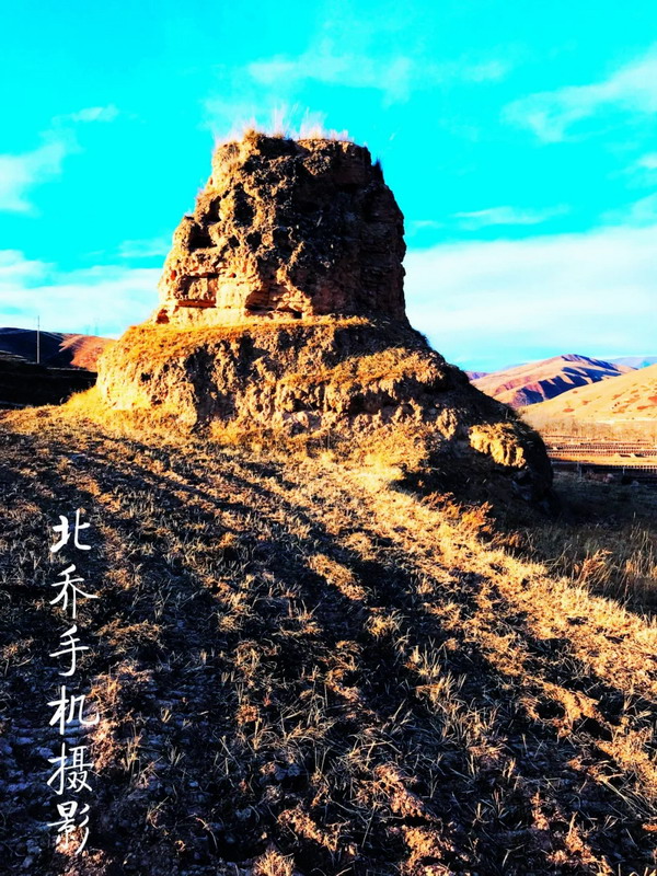在海拔近3000米的高原上,沿著雜草叢生的小路登上這不足百米高的地方,多少有些吃力。以往走在曲折的小路上,只要時間寬裕,我總會緩慢而行,讓雙腳踩出詩意。這一次不同。再有情調的小路,我也不在意,我的目標在高處的平臺上。過程是迷人的,如果對目的地懷有強烈的渴望,路上的時光,就會被壓縮再壓縮,沿路的風景都將視而不見。我像戰士搶占山頭一樣,急切地行走。這個叫牛頭城的地方,位于臨潭縣古戰鄉的龍首山上。此前,我曾經數次經過。遠遠望去,配得上壯觀二字。秋季時,群山蒼茫,幾個形態各異的土堆格外醒目。我總把它們看成巨大的草垛。渾身金黃,堆起莊稼人一年的期盼。這樣的草垛,總是給人踏實、充盈之感,絲毫沒有咄咄逼人之勢。而在春夏之時,它們就換上一身綠衣,仿佛巨型莊稼。無論什么時候,它們都像海中的小島,大河邊的碼頭。曾在書籍中與牛頭城多次相遇。西晉永嘉末(公元313年),吐谷渾(北方少數民族之一的鮮卑族慕容氏族吐谷渾部落)占據洮州今舊城、古戰等地。北魏孝文帝元宏太和十五年(公元491年),吐谷渾在洮州修筑了牛頭城和洮陽城等。聽聞從高處看,因城廓為倒梯形,前低后高、上寬下窄、型如牛,故意稱為牛頭城。只是我難尋一高處俯瞰。當然,我也不愿意居高臨下看待它。這多少有些藐視之嫌。我喜歡走近它。