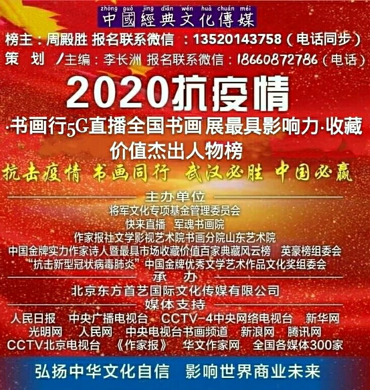 為拓展入圍中國金牌實(shí)力作家詩人暨最具市場收藏價(jià)值書畫名家•百家典藏風(fēng)云榜•英豪榜,“抗擊新型冠狀病毒肺炎”中國金牌優(yōu)秀文學(xué)藝術(shù)作品文化獎,2020抗疫情5G直播最具影響力收藏價(jià)值杰出人物榜書畫家的藝術(shù)市場,即日起三榜總策劃、認(rèn)證主編李長洲將認(rèn)證各位入圍三榜書畫家的藝品水平享受入駐2020書畫行5G直播全國書畫展售大型拍賣活動待遇,為您創(chuàng)造良機(jī)實(shí)現(xiàn)作者本人和藝術(shù)作品價(jià)值,獲得創(chuàng)作勞動回報(bào)。