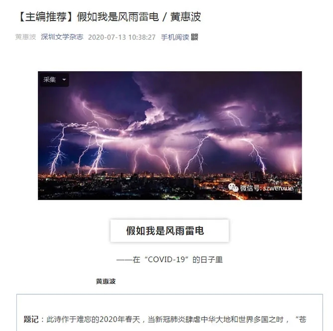 假如,此時你剛下班;假如,此時你剛吃過飯;假如,此時你正在路上……不妨慢下腳步,閱讀這首長詩《假如我是風雨雷電》:一起感受天地正氣!一起感受人間至理!一起感受一首至情至性的抗疫長詩!
