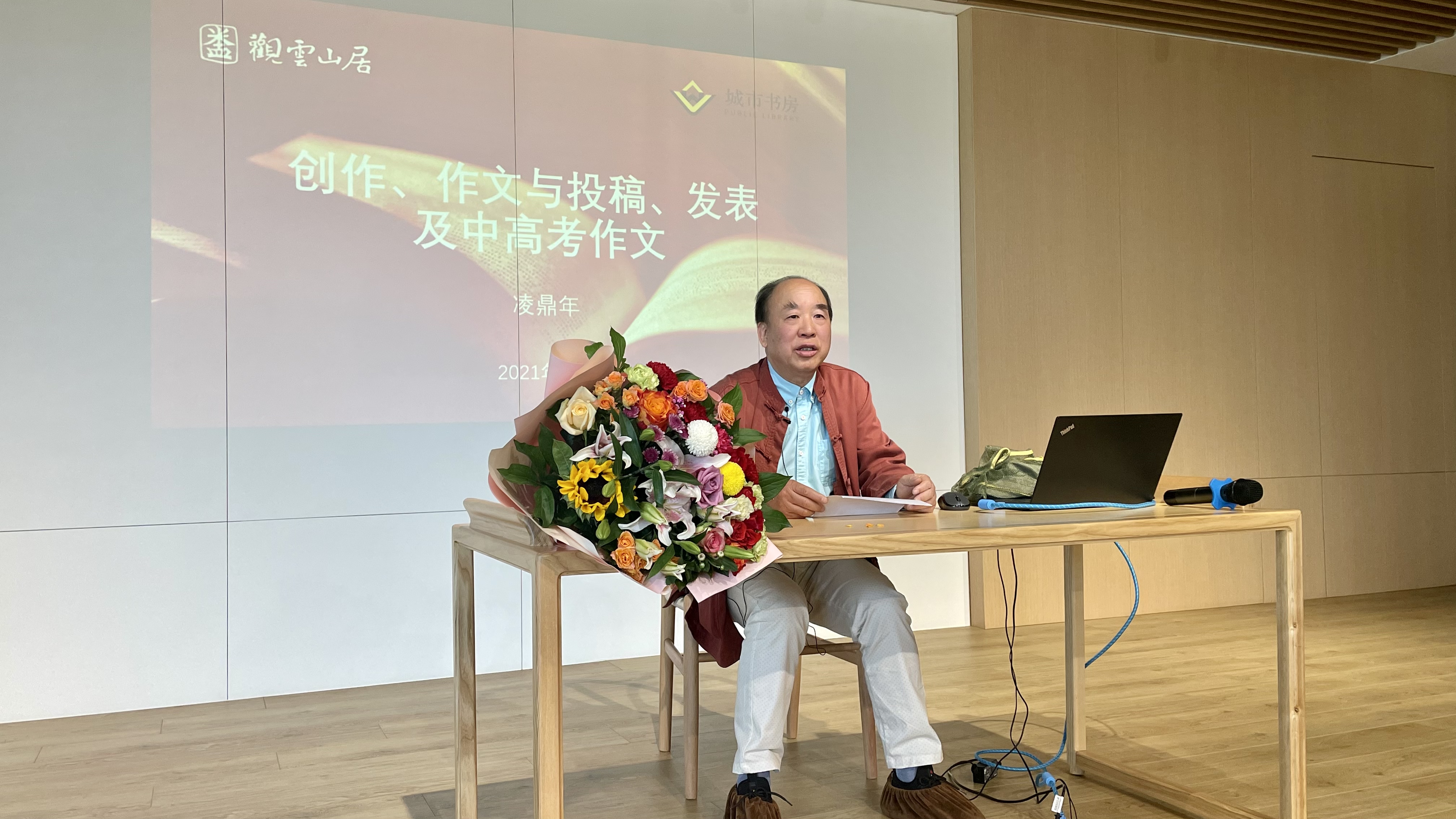 世界華文微小說研究會會長、作家網(wǎng)副總編凌鼎年應山東威海市文登區(qū)作家協(xié)會與觀云山居城市書房邀請,5月9日到文登觀云山居的城市書房做了一場《文學創(chuàng)作與投稿及中考高考作文》的講座,40多位作家與文學愛好者參與了這活動。