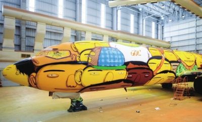 飛機也成了涂鴉藝術家的畫布。Os Gêmeos是一對孿生兄弟,他們用了大約1200罐噴漆為本次大賽巴西國家隊乘坐的專機穿上了新衣,機身上覆滿他們造型夸張的卡通形象,而整個飛機看起來就像是一只穿梭在叢林間的大鳥。如今這只“大鳥”正在巴西上空穿行,載著為該國榮譽而戰的戰士們飛向賽場。