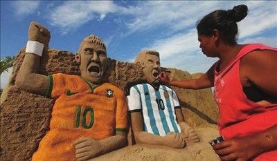 對于巴西這個因足球而瘋狂的國度來說,熱情迎接世界杯的到來自然是本土藝術家創作的主旋律。一名藝術家歷時5年集齊10萬個塑料瓶蓋,拼出一幅長15米、寬6米、重達113千克的巴西國旗,所用的材料來自薩爾瓦多沙灘上難以計數的廢棄物,而自愿參與“清理沙灘”活動的竟是本地的15個孩子;一位女性藝術家在科帕卡巴納海灘上為著名球員內馬爾和梅西塑了沙雕,前者右臂高舉,后者則緊握雙拳,兩人表達激情的方式各異;藝術家斯奎拉為世界杯32強繪制的一系列海報,由各國當家球星領銜,不僅選配經典色調,還用本國語言寫著球隊的昵稱;3D紙藝大師卡洛斯·梅拉全手工制作的紙雕作品正在香港展出,其《10號傳奇》層次感極強,一展身披10號隊服、不同國家著名球星賽場上的英姿。