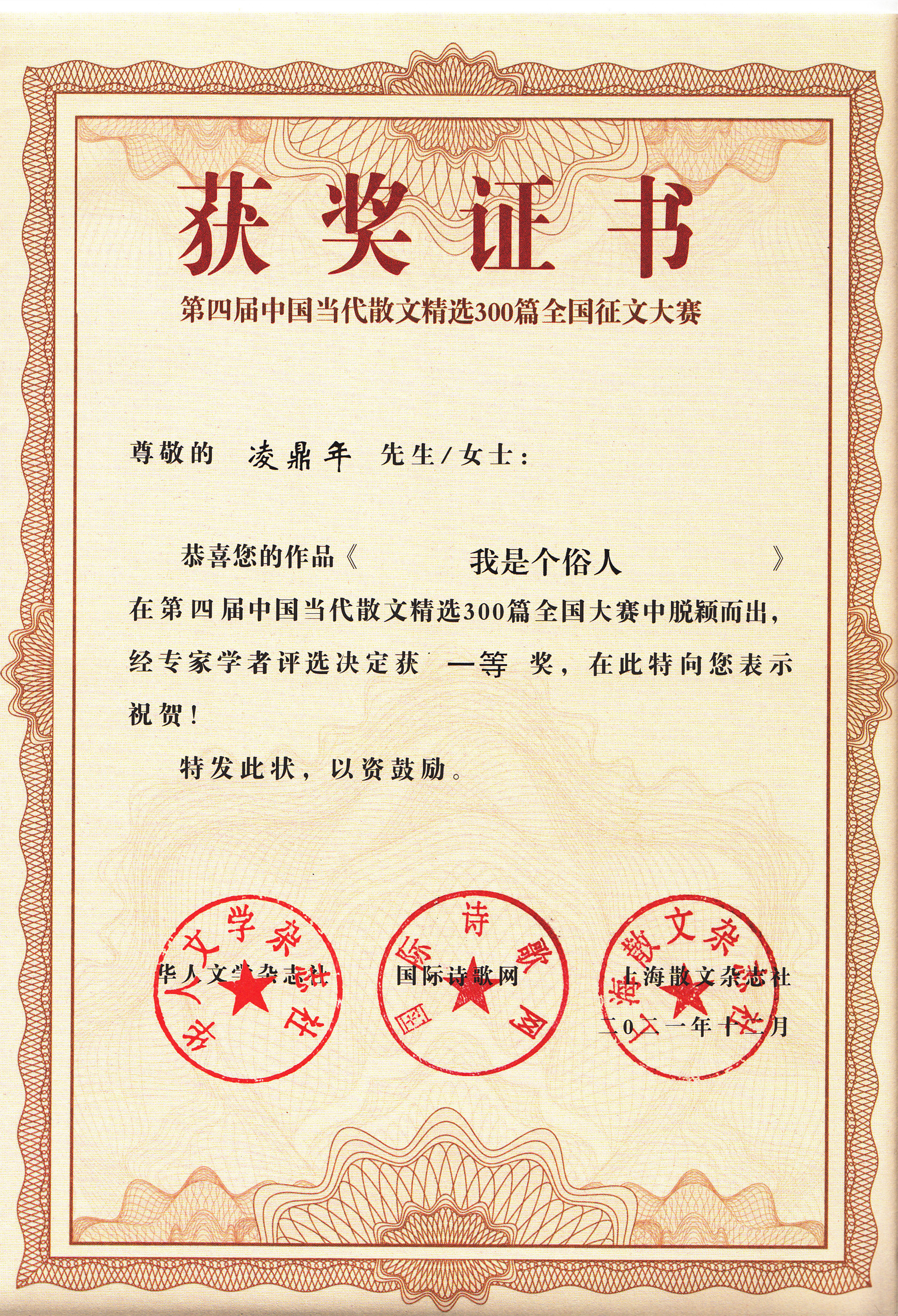 本網(wǎng)訊 凌鼎年創(chuàng)作的散文《我是個俗人》獲《華人文學(xué)》雜志社、國際詩歌網(wǎng)、《上海散文》雜志社舉辦的“第四屆中國當(dāng)代散文精選300篇全國征文大賽”一等獎。