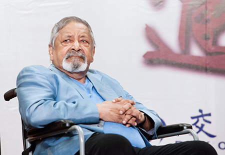 這些描述,和出現(xiàn)在中國讀者面前的奈保爾判若兩人。因為從倫敦長時間乘坐飛機,又參加《大河灣》的中文版首發(fā)式,奈保爾疲憊而虛弱,只能坐在輪椅上亮相。他的夫人納迪拉,時刻在他身邊。奈保爾顯得少言寡語,大部分回答都由夫人代勞。