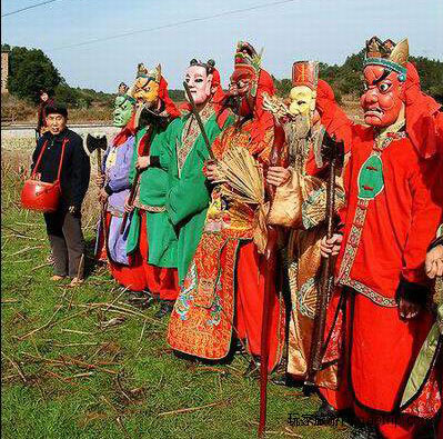 “咚咚推”是一個(gè)鑼鼓點(diǎn),咚咚,推;咚咚,推。演員戴著面具表演,踩著“點(diǎn)兒”跳一段,再站定說(shuō)臺(tái)詞。舞步靠踝步發(fā)力和支撐,姿態(tài)像日本的舞踏,或者是后者學(xué)習(xí)的儺戲。