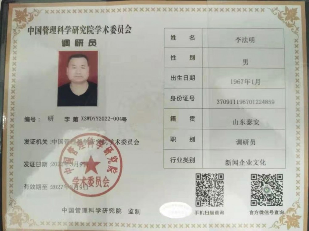 退伍軍人李法明在部隊(duì)從事新聞報(bào)道工作,曾榮立個(gè)人三等功一次并榮獲全師新聞報(bào)道評(píng)比一等獎(jiǎng)等。退伍后,曾參編了由中國(guó)人事出版社出版發(fā)行的《全國(guó)中考試題歸類(lèi)精選》實(shí)用類(lèi)大型書(shū)籍總共四冊(cè)并任語(yǔ)文類(lèi)副主編,創(chuàng)辦了《山東文學(xué)》雜志特刊并任泰安辦事處副主任,策劃創(chuàng)辦了《中國(guó)書(shū)畫(huà)名家》一、二冊(cè)并任編委,參編了《領(lǐng)導(dǎo)科學(xué)報(bào)》專(zhuān)刊《法治山東》并任編輯、記者,策劃創(chuàng)辦了國(guó)際華文傳播權(quán)威媒體《作家報(bào)》文化專(zhuān)刊《藝術(shù)世界》、集報(bào)專(zhuān)刊《書(shū)畫(huà)世界》、理論專(zhuān)刊《導(dǎo)合全勝路》并先后任專(zhuān)刊主編、副總編、總編,參編了由國(guó)務(wù)院政策研究室主管、中國(guó)言實(shí)出版社出版發(fā)行的文學(xué)理論與創(chuàng)作于一體的國(guó)家大型文學(xué)叢書(shū)《文心中國(guó)》并任叢書(shū)副主編,策劃主編了總計(jì)25萬(wàn)字的國(guó)家大型理論創(chuàng)新書(shū)籍《導(dǎo)合全勝路》并任該書(shū)執(zhí)行總編。參編了《中國(guó)作家詩(shī)人百家典藏文學(xué)書(shū)畫(huà)卷》并任編委會(huì)副主任。創(chuàng)作的26首現(xiàn)代詩(shī)被中國(guó)三大文學(xué)報(bào)之一《作家報(bào)》以專(zhuān)版在重要版面發(fā)表。《青年文學(xué)家》雜志以作家理事會(huì)濟(jì)南分會(huì)主席專(zhuān)頁(yè)在顯著版面刊登了一組詩(shī)歌新作。參編了由中央宣傳部代管,由光明日?qǐng)?bào)社出版發(fā)行的《中國(guó)書(shū)畫(huà)名家賞析》共兩冊(cè)。2021年6月22日榮獲第四屆世界文化交流偉大貢獻(xiàn)獎(jiǎng)、世界文化大使勛章,其個(gè)人近照,藝術(shù)傳略、代表名作入編2021中英雙語(yǔ)版《世界名人錄》(綜合卷-文學(xué)卷)。(本報(bào)記者韓慶全 高敏、特約通訊員郭潔報(bào)道)