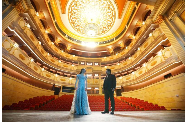 劇場色調(diào)以與鳳凰匹配的金黃色為主,內(nèi)部金黃色與紅色相交織的色系組合,將中國文化元素與歐洲古典建筑風(fēng)格相融合。總高6.5米、直徑4.5米的華麗精致的穹頂?shù)鯚簦由辖鸨梯x煌的四壁內(nèi)飾,置身其中極具觀賞歌劇的儀式感。