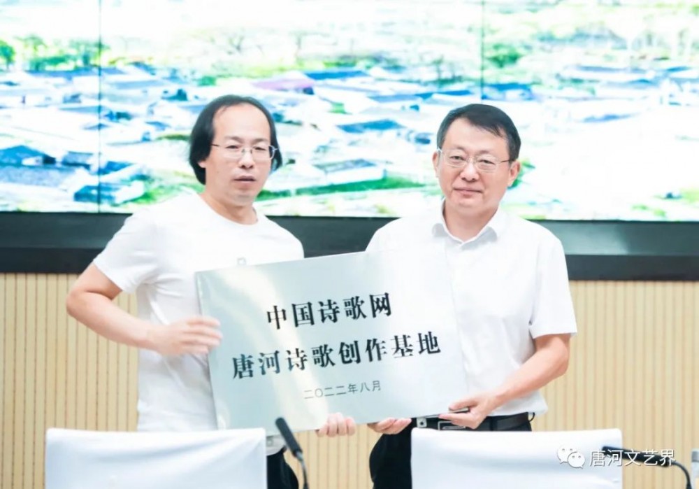 與會人員共同觀看了唐河宣傳片,《詩刊》社副主編霍俊明為中國詩歌網唐河創作基地授牌,縣委書記賀迎接牌。