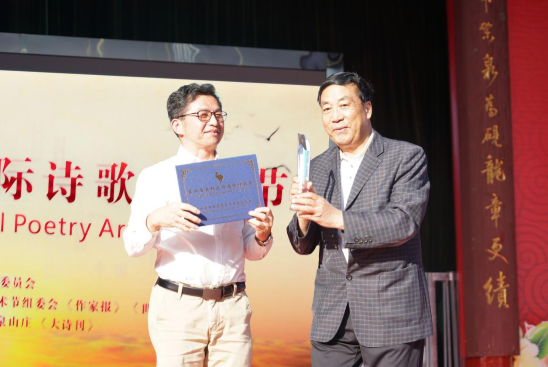 獲獎詩人代表董發(fā)亮上臺領(lǐng)獎,由中國魯迅文學院常務副院長,當代著名作家白描頒獎