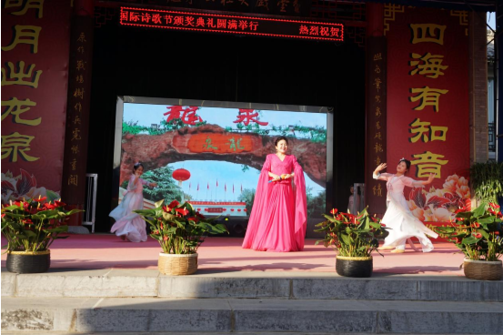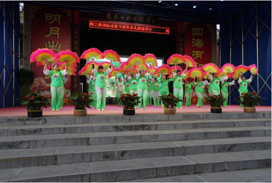 隨后《放歌龍泉山莊,詩頌一帶一路》主題詩歌朗誦會在龍泉山莊藝術(shù)隊表演的《龍泉山莊歡迎你》的鼓舞中拉開序幕。國家一級歌唱家沙莎的《龍泉美》歌伴舞把氣氛掀向了高潮;董發(fā)亮作詞的《沁園春.農(nóng)泉山莊》、伏萍作詞的《龍泉山莊,我愛你》,讓觀眾領(lǐng)略了龍泉深厚優(yōu)美的藝術(shù)氣質(zhì)之美;第六屆中國作協(xié)副主席黃亞洲《中國的絲綢,世界的霞光》、王芳聞《絲路頌》、凌曉晨《蜀河古鎮(zhèn)》、田繼光《河西走廊掠影》等詩電影,和北塔《盛澤,從一根絲開始》詩朗誦,更是運用詩樂音畫影結(jié)合,展示了絲綢之路千年的燦爛輝煌。