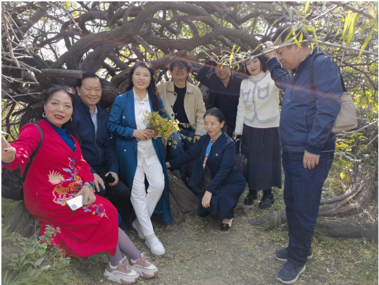 詩人在龍泉山莊千年漢盤龍柳茶樹下合影