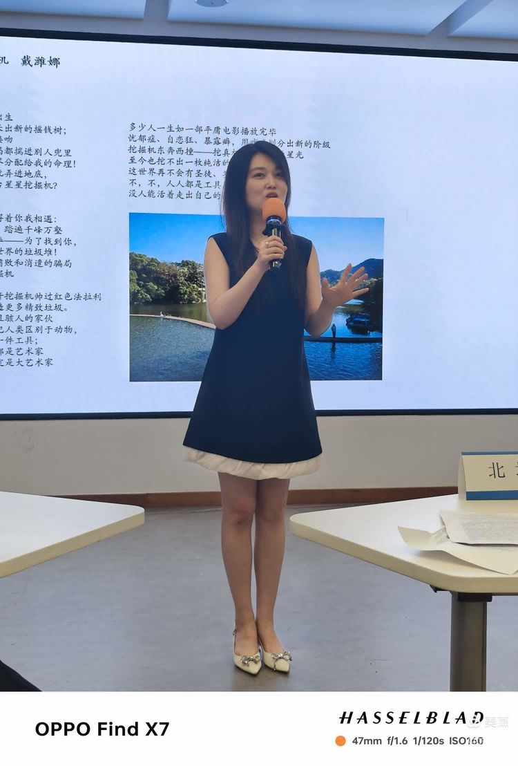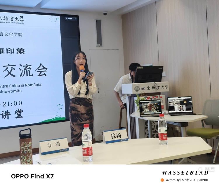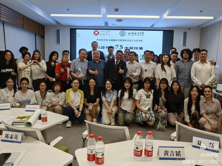 接下來(lái),主持人向來(lái)賓隆重介紹本次活動(dòng)的策劃者、北京語(yǔ)言大學(xué)教授、詩(shī)人北塔先生。北塔先生深情回憶自己跟羅馬尼亞的深厚而奇妙的緣分,他曾于2016、2017、2018連續(xù)三年三次受邀分別訪問(wèn)羅馬尼亞的雅西、比斯特里察和薩圖?馬雷等地并參加國(guó)際詩(shī)歌節(jié),其中兩次還擔(dān)任中國(guó)詩(shī)歌代表團(tuán)團(tuán)長(zhǎng)(那兩次中國(guó)團(tuán)都受到了主賓國(guó)的特殊待遇),可見(jiàn)羅馬尼亞對(duì)中國(guó)尤其是中國(guó)詩(shī)歌的厚愛(ài)。他以許多實(shí)地見(jiàn)聞和實(shí)際感受的實(shí)例,生動(dòng)表明羅馬尼亞是一個(gè)風(fēng)景秀麗、文化燦爛、人民安樂(lè)的國(guó)度,是真正的詩(shī)國(guó)。羅馬尼亞詩(shī)歌人口眾多(群眾基礎(chǔ)廣泛),詩(shī)歌活動(dòng)頻密(一年四季都有),而且詩(shī)歌與教育和宗教緊密結(jié)合,詩(shī)會(huì)形式特別豐富(與音樂(lè)、美術(shù)、戲劇等藝術(shù)深度融合)。北塔說(shuō),作為一個(gè)詩(shī)人,他每次在羅馬尼亞都賓至如歸、詩(shī)興大發(fā),寫(xiě)下了很多作品。這次他精選了三首他以羅馬尼亞為靈感源泉?jiǎng)?chuàng)作的詩(shī)歌,進(jìn)行現(xiàn)場(chǎng)念誦,并分享了其靈感來(lái)源和思想內(nèi)涵。他特別感謝羅馬尼亞之旅,使他意外獲得了關(guān)于當(dāng)代社會(huì)語(yǔ)境下理想與命運(yùn)、宗教與文化以及藝術(shù)與人生等諸多復(fù)雜關(guān)系進(jìn)行反思的絕佳場(chǎng)景和機(jī)會(huì)。參與分享的其他詩(shī)人依次為戴濰娜、牛黃、陳泰灸、邵建國(guó)、克勞狄烏·弗洛里安、趙劍華。各位到場(chǎng)的詩(shī)人先是講述自己與羅馬尼亞的故事,在詩(shī)人們繪聲繪色的講述中,羅馬尼亞的雅西成了長(zhǎng)安一般交融著燦爛文化與多元浪漫的伊甸園。在兩國(guó)文化神跡般的碰撞下孕育出的詩(shī)歌獨(dú)具異域風(fēng)情與情感溫度,無(wú)論妍媸巨細(xì)、悲歡憂喜,一切人物情態(tài)都能隨物賦形,淋漓盡致。故事深入人心,誦詩(shī)同樣精彩。詩(shī)人們將自己的感情傾注于詩(shī)歌,呼喚著落墨時(shí)涌現(xiàn)的奇思妙想,呼應(yīng)著一撇一捺間的萬(wàn)千氣象,也讓佳作迎來(lái)了又一次新生。戴濰娜從女性視角將大海和故鄉(xiāng)擬人化,以溫婉的筆調(diào)和清澈的嗓音伴隨詩(shī)中的小魚(yú)游曳,重章復(fù)沓,溯回還游,帶給聽(tīng)眾美學(xué)的享受與哲學(xué)的思考。東北詩(shī)人陳泰灸的詩(shī)從蘋(píng)果釀酒引申到羅馬尼亞建國(guó)百年的滄桑,讓一條小河的印象久久地流淌在詩(shī)人和聽(tīng)眾的心間。愛(ài)情詩(shī)人牛黃(吉韜)來(lái)自廣西,與雪初相識(shí)竟在羅馬尼亞,只這一次的情緣,卻讓他對(duì)雪的贊美超過(guò)了他歌頌了幾十年的愛(ài)情。來(lái)自內(nèi)蒙的詩(shī)人趙劍華,一如既往的展現(xiàn)冷俊洞察秋毫的文風(fēng),他在詩(shī)中將羅馬尼亞的美麗風(fēng)景和熱情訪問(wèn)的中國(guó)詩(shī)人們?nèi)跒橐惑w、合而為一,載著詩(shī)歌的翅膀,詩(shī)人對(duì)羅馬尼亞的贊頌和欣賞水到渠成。詩(shī)人邵建國(guó)另辟蹊徑,他將拍攝于羅馬尼亞的一百多張照片精心制作成PPT,為現(xiàn)場(chǎng)嘉賓和師生奉獻(xiàn)了一場(chǎng)視覺(jué)與靈魂的盛宴。羅馬尼亞駐華使館文化參贊、作家、詩(shī)人克勞狄烏·弗洛里安先生也參與到交流會(huì)中,用羅語(yǔ)朗讀羅馬尼亞十九世紀(jì)末詩(shī)人亞力克山德魯·弗拉德胡策的詩(shī)歌,分享羅馬尼亞真實(shí)歷史與非凡文采的絕佳碰撞,讓大家感受到羅馬尼亞經(jīng)典詩(shī)歌的永鍍光華的厚重。本次中羅詩(shī)歌文化活動(dòng)也開(kāi)啟了線上直播交流,中國(guó)旅羅詩(shī)人新白、羅籍旅華詩(shī)人妮可在線上朗誦了他們身在異域創(chuàng)作的詩(shī)歌。在場(chǎng)的所有人徜徉在詩(shī)歌與文化的潤(rùn)澤里。誦讀環(huán)節(jié)結(jié)束,弗洛里安參贊熱情邀請(qǐng)各位詩(shī)人們和中羅師生積極參與到羅馬尼亞駐華大使館各項(xiàng)活動(dòng)當(dāng)中來(lái),日后共同進(jìn)行詩(shī)歌文化交流、共慶中羅建交75周年,通過(guò)文化交流為兩國(guó)友誼長(zhǎng)青作出貢獻(xiàn)、留下彌足珍貴的記憶。交流會(huì)接近尾聲,由于賓主熱情高漲,大家仍然意猶未盡,詩(shī)歌文化交流活動(dòng)延長(zhǎng)許久。學(xué)生代表向在場(chǎng)嘉賓獻(xiàn)花,參會(huì)人員大合照中的歡顏宣告著此次活動(dòng)的圓滿成功。照片定格的是滿載收獲而歸的一瞬,存留的卻是大家對(duì)詩(shī)歌的熱愛(ài)和對(duì)中羅兩國(guó)友誼的贊美。