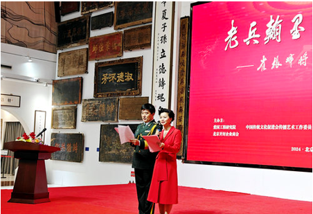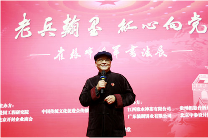 開(kāi)幕式由祝學(xué)軍和雙語(yǔ)主持人朱丹共同主持;86歲高齡老將軍、崔根峰將軍戰(zhàn)友、原工程兵工程指揮學(xué)院政委孫之貴少將發(fā)表了熱情洋溢的講話,他說(shuō):“崔根峰將軍不僅是一名老兵,而且是一名好兵,他不僅是一名將軍,而且是一位文武兼?zhèn)涞膶④姡裉煳矣?span>“人書(shū)俱老,德藝皆馨”八個(gè)字來(lái)形容他一點(diǎn)也不為過(guò),崔根峰首先是一位武將,是經(jīng)過(guò)戰(zhàn)爭(zhēng)鍛煉而成長(zhǎng)起來(lái)的將軍。他1963年入伍,1964年參加全軍大比武,取得了全軍第二名的好成績(jī),受到了葉劍英元帥的親切接見(jiàn),1979年時(shí)任團(tuán)政委的他,和團(tuán)長(zhǎng)一起帶領(lǐng)一個(gè)團(tuán)參加了對(duì)越邊境自衛(wèi)還擊作戰(zhàn),榮獲集體三等功;他又是一名儒將,國(guó)防大學(xué)首屆畢業(yè)生,在《解放軍報(bào)》等刊物上發(fā)表文章130余篇,出版了《實(shí)試感悟》一文;同時(shí)他還是著名的軍旅書(shū)法家,為電視劇《亮劍》等10余部影視劇題寫(xiě)劇名,并在書(shū)法藝術(shù)界享有極高的聲譽(yù)。”