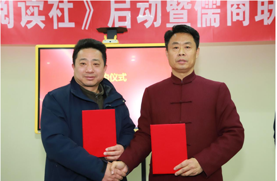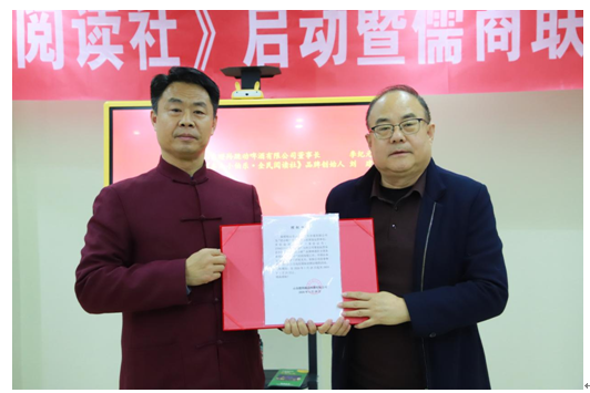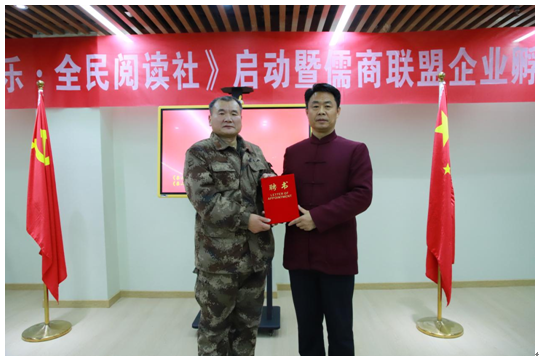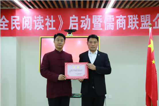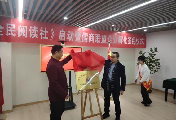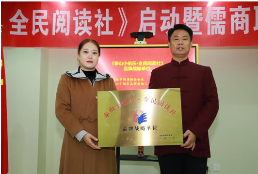濟(jì)南市統(tǒng)計(jì)局招商引資項(xiàng)目人趙玉棟(右)與山東小伯樂(lè)文化傳媒有限公司董事長(zhǎng)、泰山小伯樂(lè)品牌創(chuàng)始人劉建共同為《泰山小伯樂(lè)·全民閱讀社》揭牌并講話