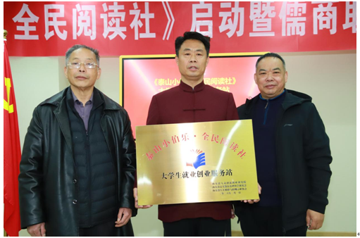 山東外事職業(yè)大學(xué)高級(jí)顧問(wèn)、文史專家魏伯河教授(左)與山東交通學(xué)院教授、碩士研究生導(dǎo)師、山東省大眾創(chuàng)新創(chuàng)業(yè)研究院副院長(zhǎng)鐘兵教授(右)為山東小伯樂(lè)文化傳媒有限公司董事長(zhǎng)、泰山小伯樂(lè)品牌創(chuàng)始人劉建頒發(fā)《泰山小伯樂(lè)·全民閱讀社》大學(xué)生就業(yè)創(chuàng)業(yè)服務(wù)站牌匾