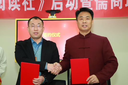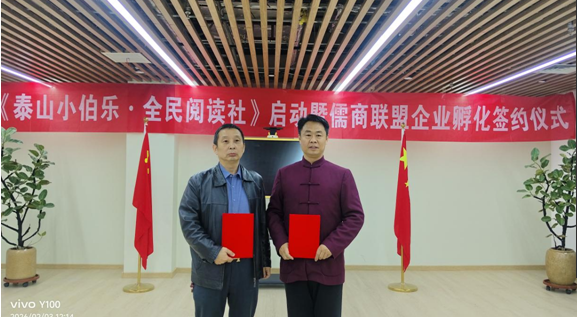 山東小伯樂(lè)文化傳媒有限公司董事長(zhǎng)、泰山小伯樂(lè)品牌創(chuàng)始人劉建與中企黨建基地吳柯良主任簽約戰(zhàn)略合作儀式