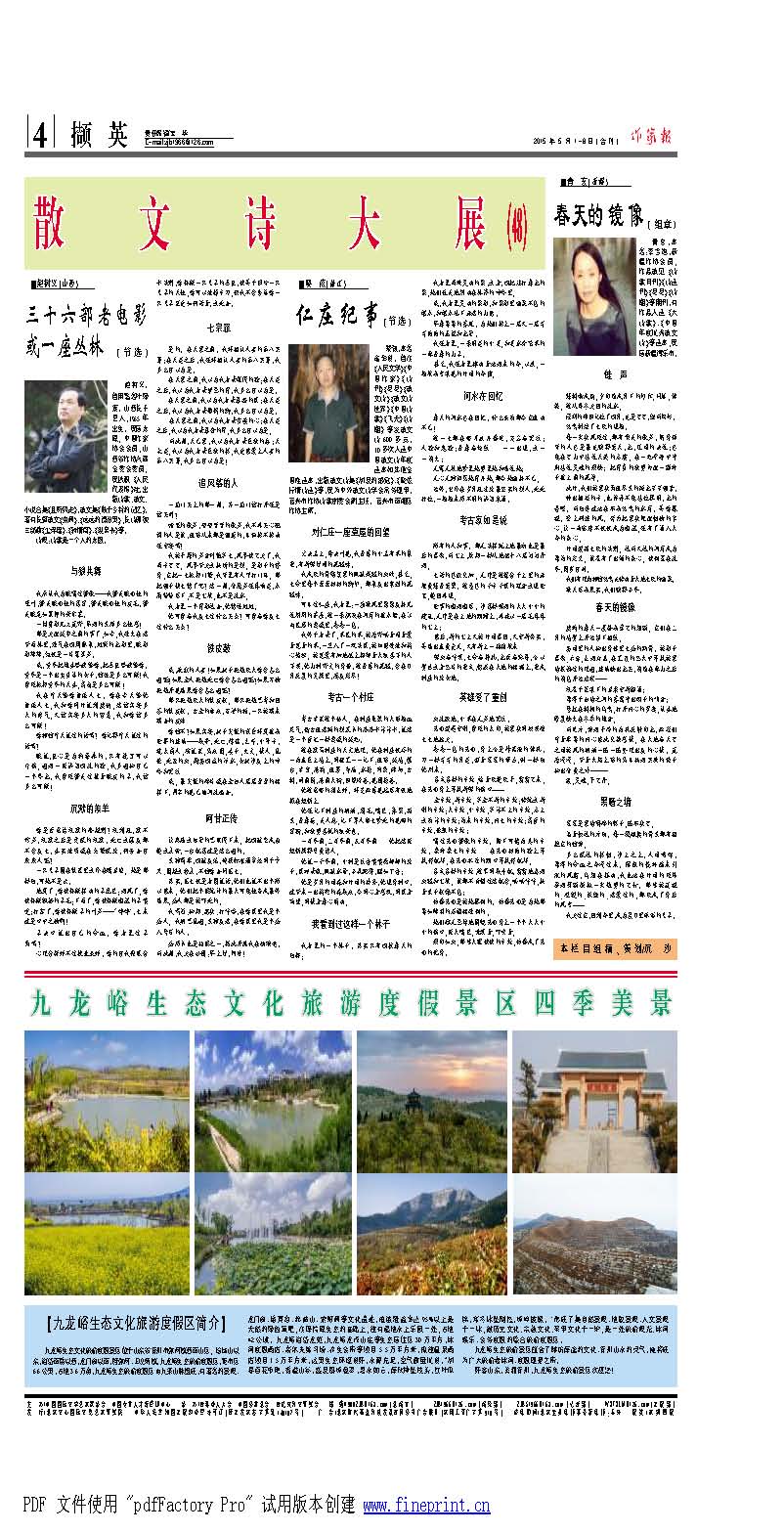 2015年5月1-8日《作家報》合刊 4版 2015-05-11 未知作家報 免責聲明:文章內容不代表華文作家網(wǎng)_作家報立場,華文作家網(wǎng)_作家報不對其內容的真實性、完整性、準確性給予任何擔保、暗示和承諾,僅供讀者參考,文章版權歸原作者所有。如本文內容影響到您的合法權益(內容、圖片等),請及時聯(lián)系華文作家網(wǎng)_作家報,我們會及時刪除處理。