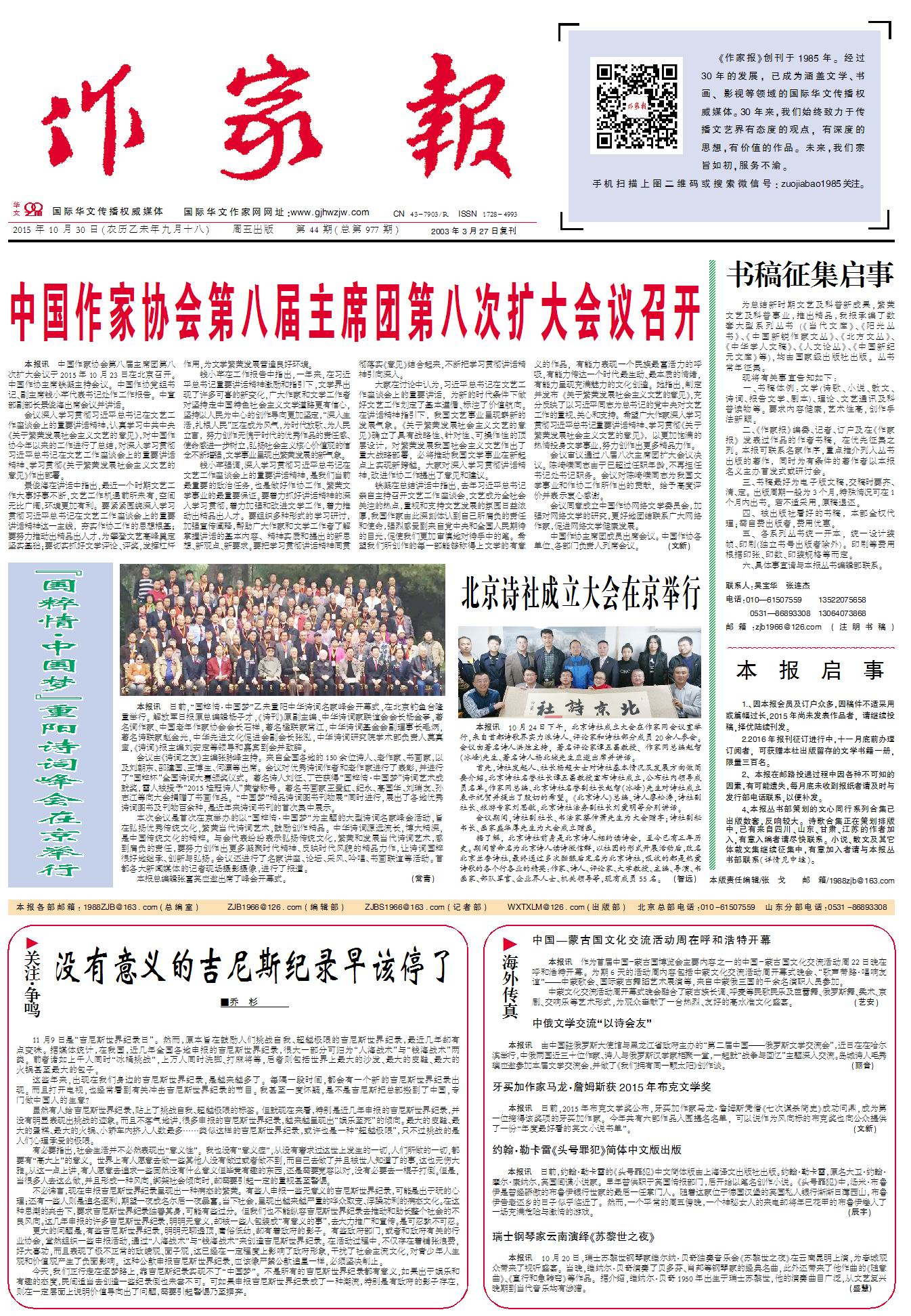 10月30日《作家報》出版,歡迎訂閱、合作 2015-10-30 未知國際華文作家網(wǎng) 免責(zé)聲明:文章內(nèi)容不代表華文作家網(wǎng)_作家報立場,華文作家網(wǎng)_作家報不對其內(nèi)容的真實性、完整性、準(zhǔn)確性給予任何擔(dān)保、暗示和承諾,僅供讀者參考,文章版權(quán)歸原作者所有。如本文內(nèi)容影響到您的合法權(quán)益(內(nèi)容、圖片等),請及時聯(lián)系華文作家網(wǎng)_作家報,我們會及時刪除處理。