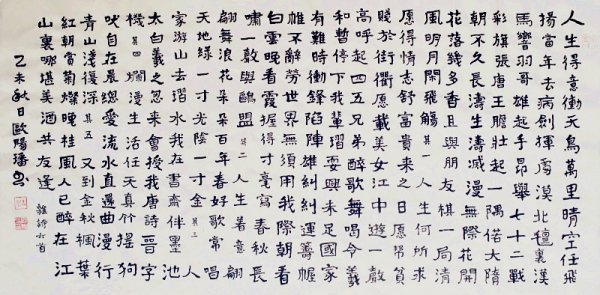 歐陽(yáng)璠看起來(lái)是孤獨(dú)的,但他決不寂寞。他在孤獨(dú)中與古人對(duì)話,返璞歸真;他也在與自己對(duì)話,使內(nèi)心豐富安寧。觀他的楷書(shū),筆筆靜肅、字字靜寂、行行靜修、整幅靜穆,無(wú)巧色、無(wú)輕滑、不花俏、筆筆形斷,字字意連,不經(jīng)意看是一盤(pán)散沙,細(xì)品之,則“筆筆呼應(yīng),字字接貫,前后左右,自能一氣相生矣。”