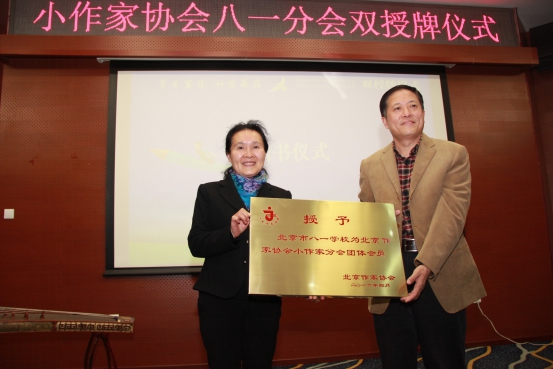 北京市作協(xié)副主席、秘書長王升山向八一學(xué)校授牌。
